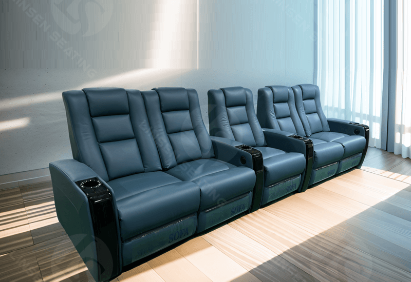 Rich dark blue leather finish: Blue leather used for this theater loveseats is top grain bovine hides treated with aniline dyes to preserve natural texture and breathability. It is anti-scratch coated and easy to clean.